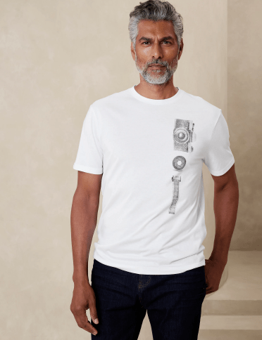 - The fit: Banana Republic graphic t-shirts are tailored to fit your body shape and size. They are not too loose or too tight, but just right. They hug your chest and arms, and fall at your waist. They make you look taller, leaner, and more muscular. They also show off your sense of humor, your interests, or your attitude. They make you stand out from the crowd and attract attention.
