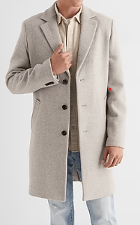 Express typically offers several different color and style variations throughout the season. An oatmeal wool option available now is a great choice to pair with lighter colors such as light washed jeans and a white turtleneck. A well-fitting topcoat is the best way to stay warm without looking that a sack of potatoes!